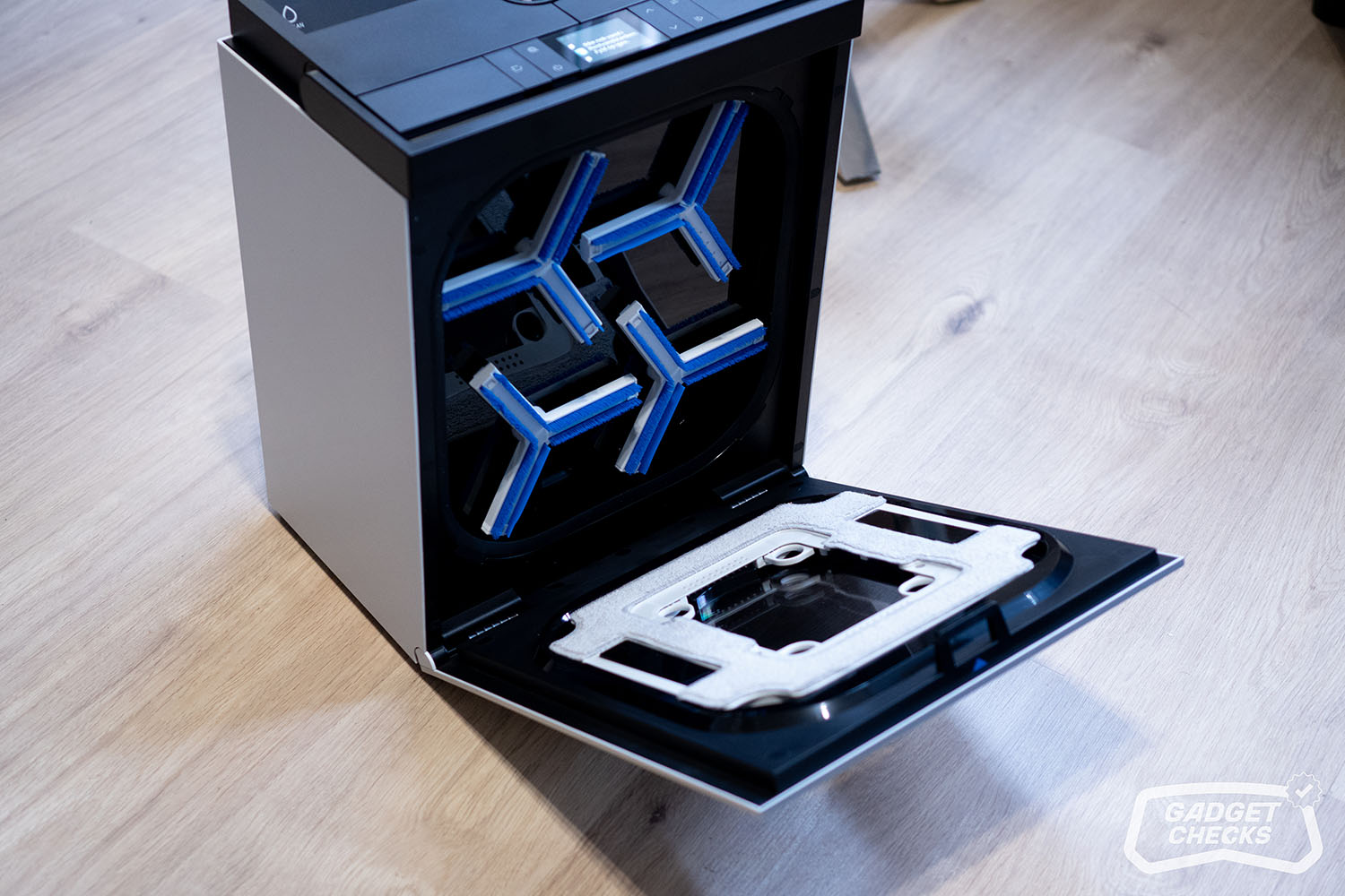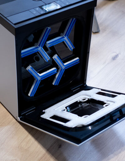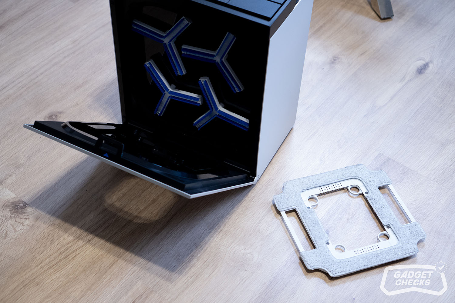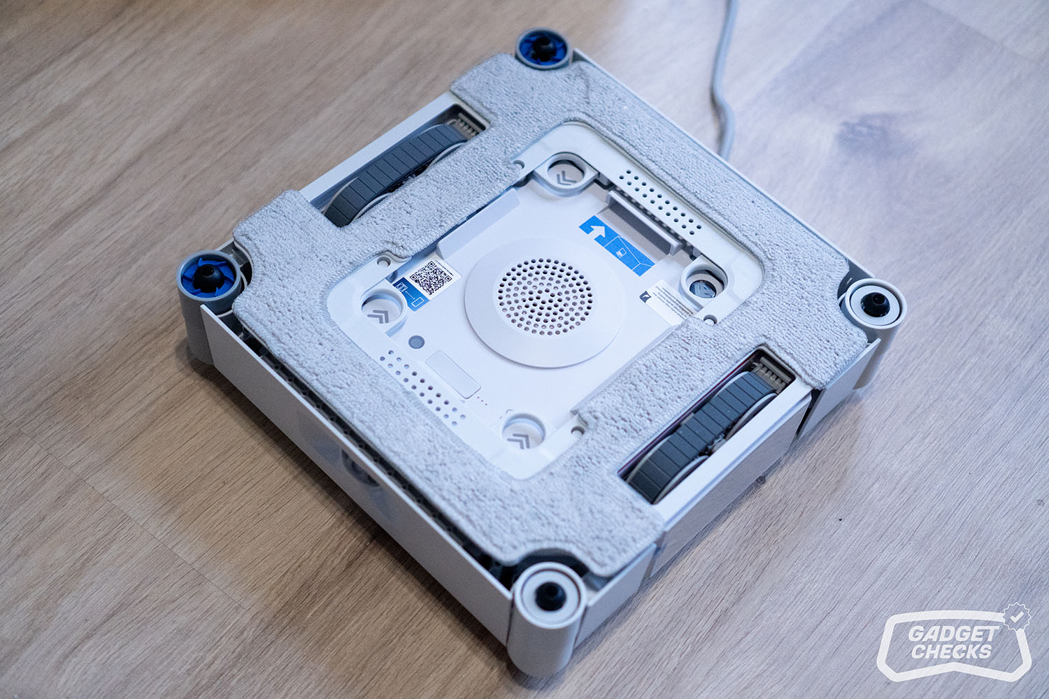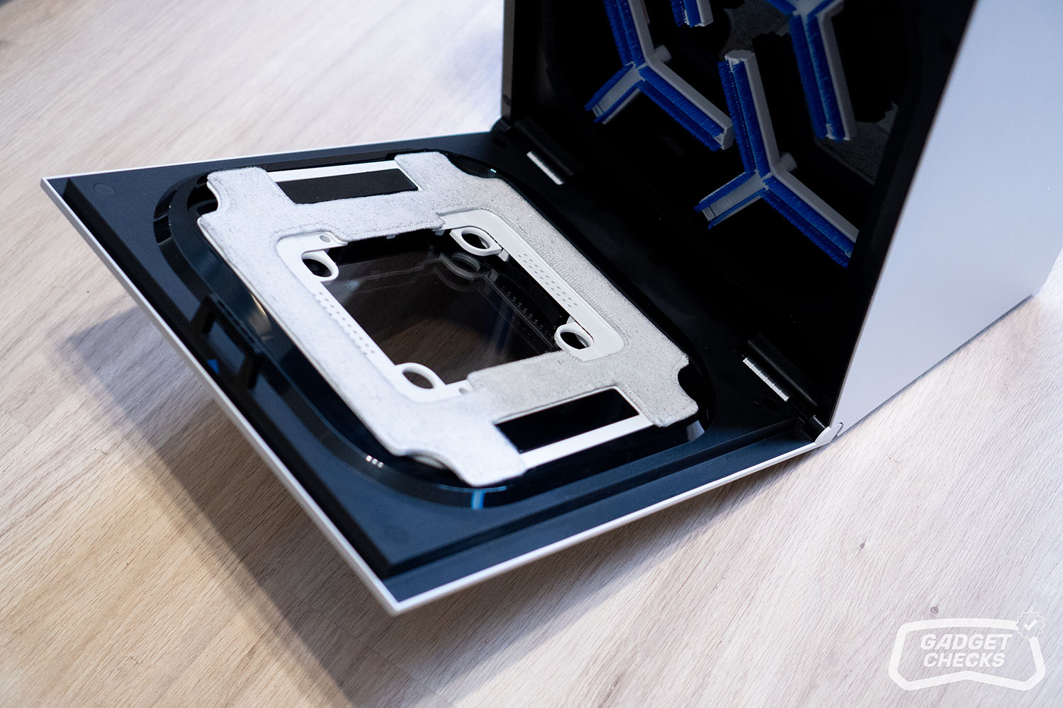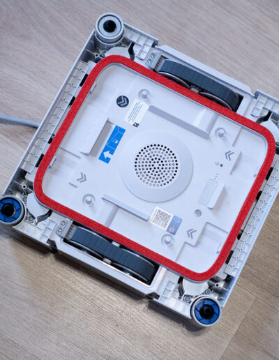 Sind die Fenster gereinigt, kümmert sich die Station um den nächsten Schritt. Dafür wird der WINBOT W3 OMNI zunächst umgedreht. Auf der Rückseite befinden sich vier kreisförmige Hebel, die sich nach innen drücken lassen. Sobald diese entriegelt sind, lässt sich das Wischpad ohne Kraftaufwand abnehmen. Das Anbringen funktioniert genauso einfach in umgekehrter Reihenfolge, was im Alltag angenehm unkompliziert ist. Im nächsten Schritt wird über die entsprechende Taste unten links die Frontabdeckung der Station geöffnet. Im Inneren befindet sich eine klar strukturierte Aufnahme für das Wischpad, sodass das Einsetzen praktisch selbsterklärend ist und ohne großes Nachjustieren gelingt. Auf der Rückseite im Innenraum fallen vier Bürsten auf, die später die eigentliche Reinigung des Pads übernehmen. Zusätzlich bietet die Station auch eine Funktion, mit der sich der Innenraum selbst reinigen lässt, selbst dann, wenn kein Wischpad eingesetzt ist.