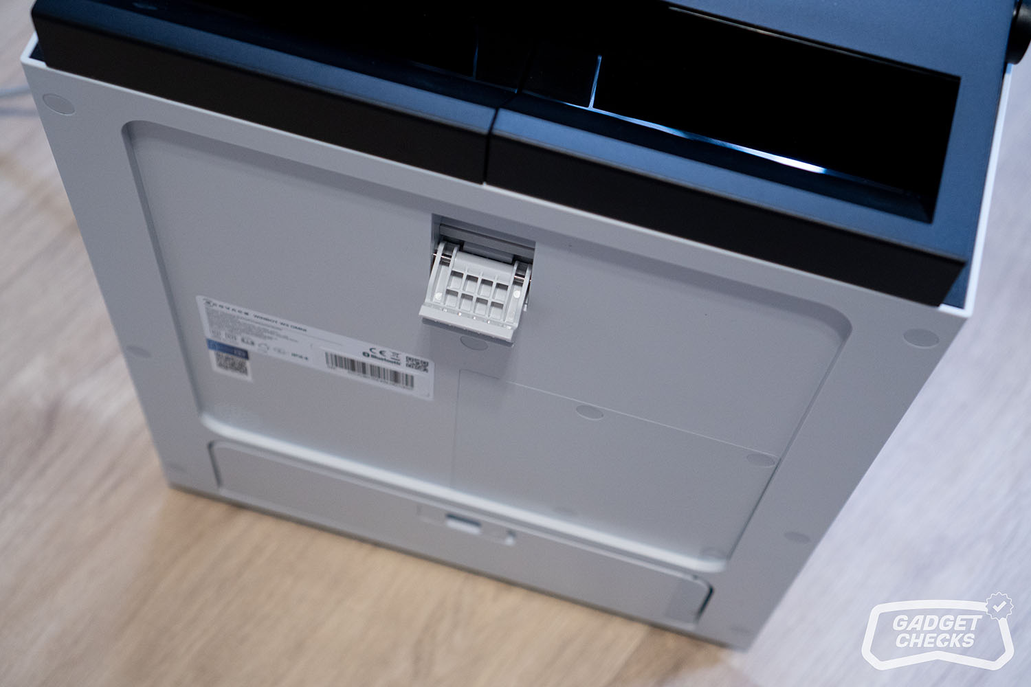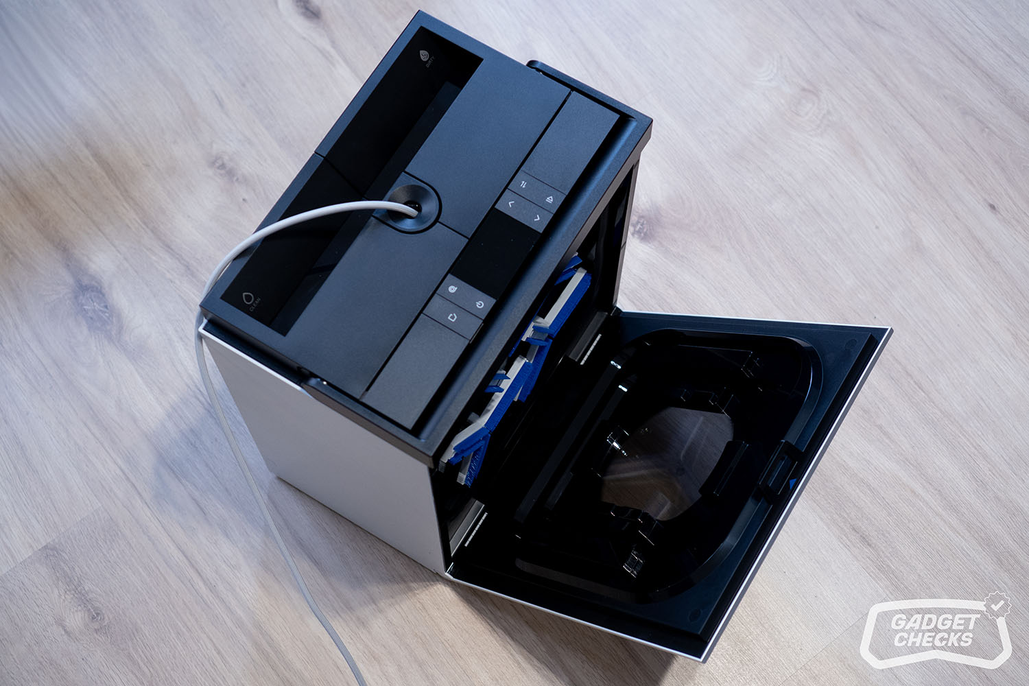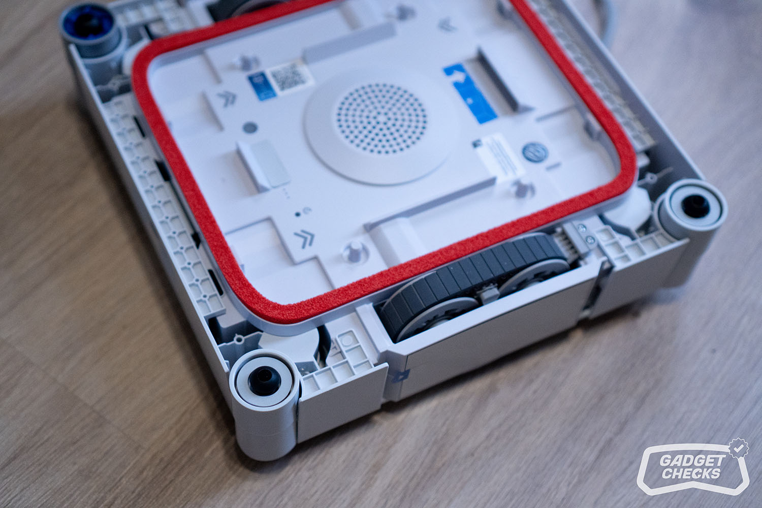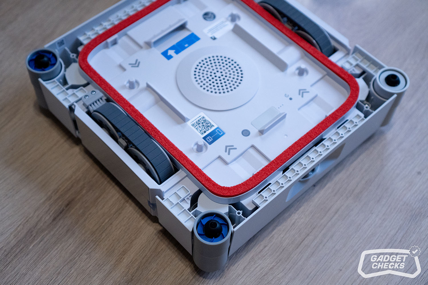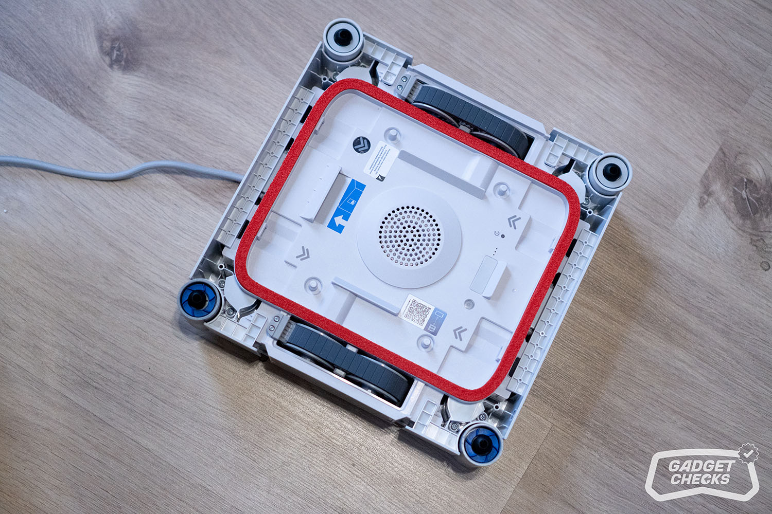 Sind die Fenster gereinigt, kümmert sich die Station um den nächsten Schritt. Dafür wird der WINBOT W3 OMNI zunächst umgedreht. Auf der Rückseite befinden sich vier kreisförmige Hebel, die sich nach innen drücken lassen. Sobald diese entriegelt sind, lässt sich das Wischpad ohne Kraftaufwand abnehmen. Das Anbringen funktioniert genauso einfach in umgekehrter Reihenfolge, was im Alltag angenehm unkompliziert ist. Im nächsten Schritt wird über die entsprechende Taste unten links die Frontabdeckung der Station geöffnet. Im Inneren befindet sich eine klar strukturierte Aufnahme für das Wischpad, sodass das Einsetzen praktisch selbsterklärend ist und ohne großes Nachjustieren gelingt. Auf der Rückseite im Innenraum fallen vier Bürsten auf, die später die eigentliche Reinigung des Pads übernehmen. Zusätzlich bietet die Station auch eine Funktion, mit der sich der Innenraum selbst reinigen lässt, selbst dann, wenn kein Wischpad eingesetzt ist.