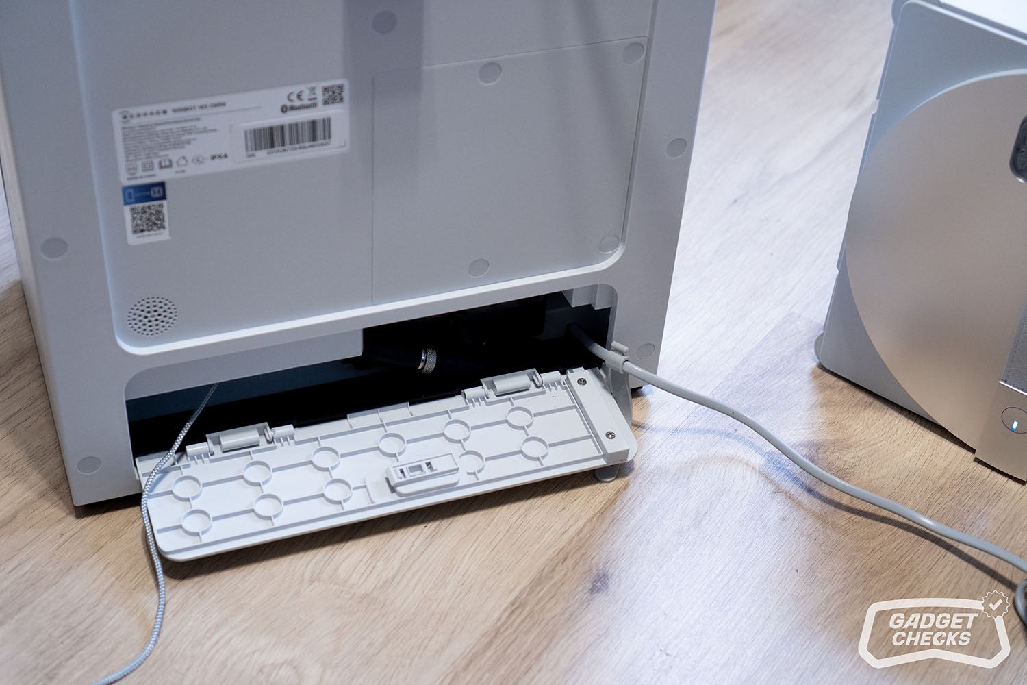 Das Ende der Reinigung wird durch Sprachansagen und akustische Signale angekündigt. Bleibt der Roboter nach dem Einsatz längere Zeit ungenutzt, meldet sich die Station nach einer gewissen Zeit und weist darauf hin, dass die Station heruntergefahren wird. Gleichzeitig gibt es Hinweise, das Wischpad zu entfernen oder zu reinigen. Je nach gewähltem Modus kann es auch während der Reinigung Hinweise geben, wenn das Pad zwischendurch gereinigt werden sollte, was vor allem bei intensiveren Programmen der Fall ist. Nach dem Einsatz wird das Wischpad entnommen, die Frontklappe der Station geöffnet und das Pad in die entsprechende Vorrichtung eingesetzt. Der Roboter selbst wird an der Rückseite der Station eingehängt. Anschließend lässt sich per Knopfdruck der automatische Kabeleinzug starten. Auch hier wurde mitgedacht: Erkennt das System einen Widerstand, etwa weil der Roboter noch nicht korrekt eingehängt ist, stoppt der Einzug sofort. Das verhindert unnötige Belastung und wirkt insgesamt sehr durchdacht.