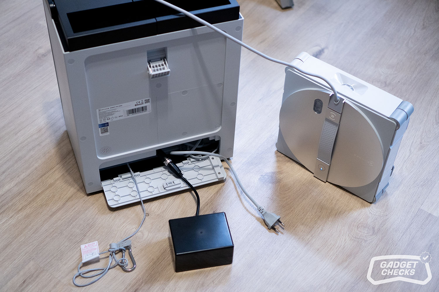 Auch die Station trägt mit ihrem Saugfuß einen großen Teil zur Stabilität bei, wie bereits beschrieben. Wer dennoch eine zusätzliche Absicherung nutzen möchte, findet im Kabelfach ein weiteres Sicherungsseil. Dieses lässt sich per Karabinerhaken beispielsweise an einer Gardinenstange oder einem festen Gegenstand befestigen. Im Alltag wirkt das fast schon übervorsichtig, da die vorhandenen Sicherheitsmechanismen bereits sehr zuverlässig arbeiten. Getestet wurde es dennoch, um das gesamte Konzept einmal vollständig auszuprobieren.