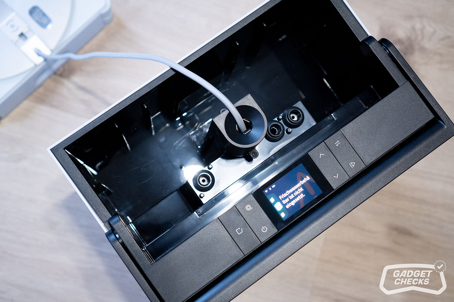 Ist der ECOVACS WINBOT W3 OMNI eingerichtet, kann es direkt losgehen. Zunächst wird die Station eingeschaltet, woraufhin man direkt mit dem bekannten Startsound begrüßt wird, den man bereits von den DEEBOT-Modellen kennt. Gleichzeitig erscheint eine ansprechende Grafik auf dem Display und die Sprachausgabe setzt ein. Beim ersten Einsatz empfiehlt das System, das Wischpad einmal zu reinigen und gleichzeitig anzufeuchten. Auf die Details der Waschfunktion gehen wir später noch genauer ein. Zuvor wird der Frischwassertank befüllt und die Reinigungslösung direkt am Roboter eingefüllt. Die Öffnung befindet sich auf der Oberseite und ist durch eine flexible Silikonabdeckung geschützt.