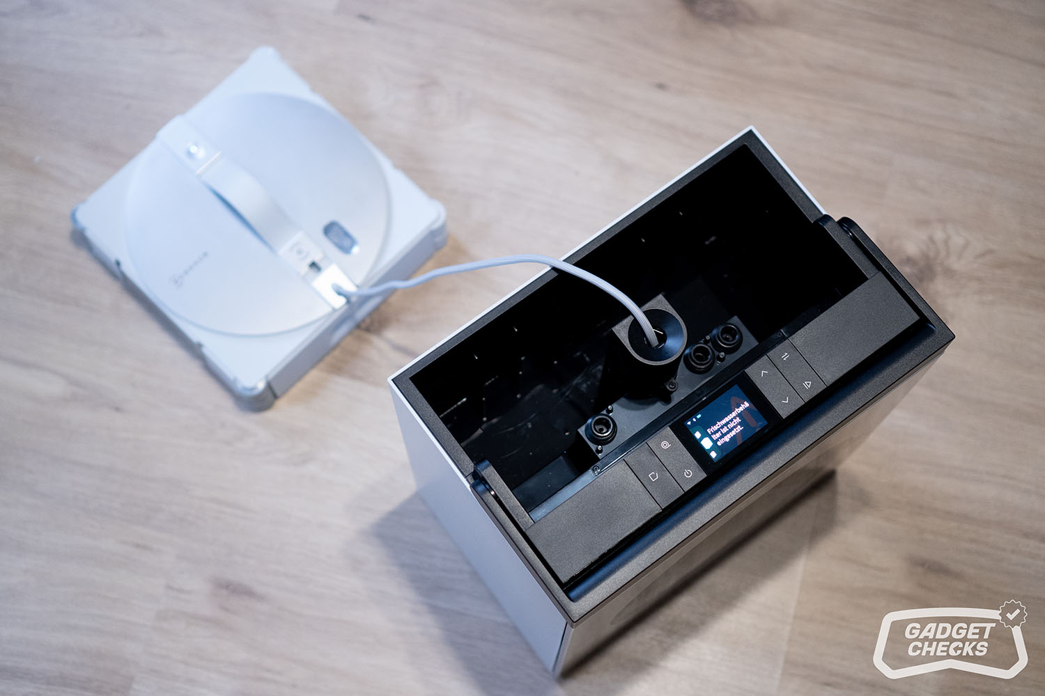 Ist der gesamte Reinigungsprozess abgeschlossen und das Wischpad aufbereitet, schaltet sich die Station im Akkubetrieb nach etwa 15 Minuten automatisch ab. Zuvor erfolgt ein Hinweis, das Wischpad zu entnehmen und das Reinigungsfach zu trocknen, da sich dort sichtbar Feuchtigkeit sammelt. Im Alltag hat sich hier einfache Küchenrolle als besonders praktisch erwiesen, alternativ funktioniert natürlich auch ein normales Tuch problemlos.