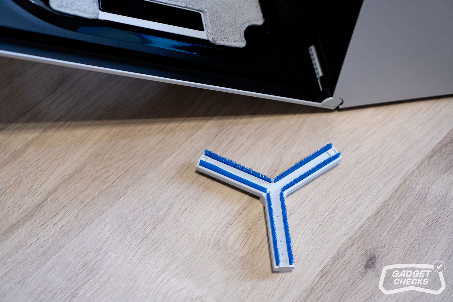 Mit der TruEdge-Technologie verfolgt ECOVACS beim WINBOT W3 OMNI einen gezielten Ansatz, um die oft vernachlässigten Randbereiche besser in den Reinigungsprozess einzubeziehen. Die entsprechende Einheit ist gut sichtbar an einer Seite des Roboters positioniert und durch einen blauen Farbton gekennzeichnet, was nicht nur optisch auffällt, sondern auch funktional nachvollziehbar ist. Sobald der Roboter an Kanten oder Rahmen entlangfährt, werden die Bürsten aktiv ausgefahren und kümmern sich gezielt um diese stärker verschmutzten Bereiche. Kehrt das Gerät anschließend wieder auf eine normale Glasfläche zurück, ziehen sich die Bürsten automatisch wieder ein.
