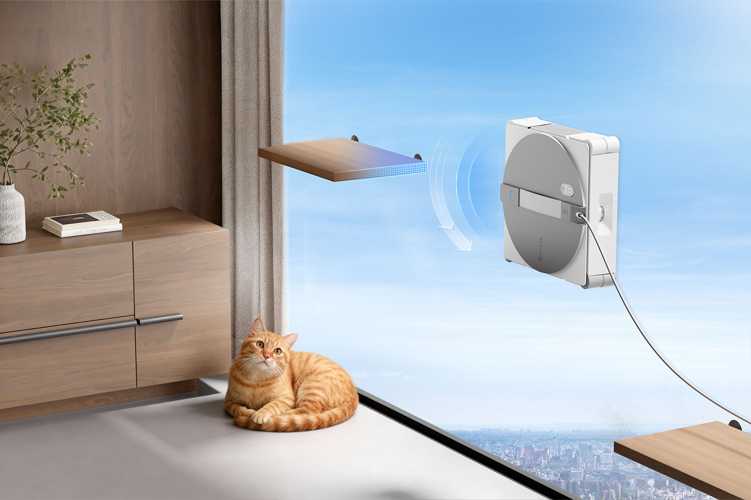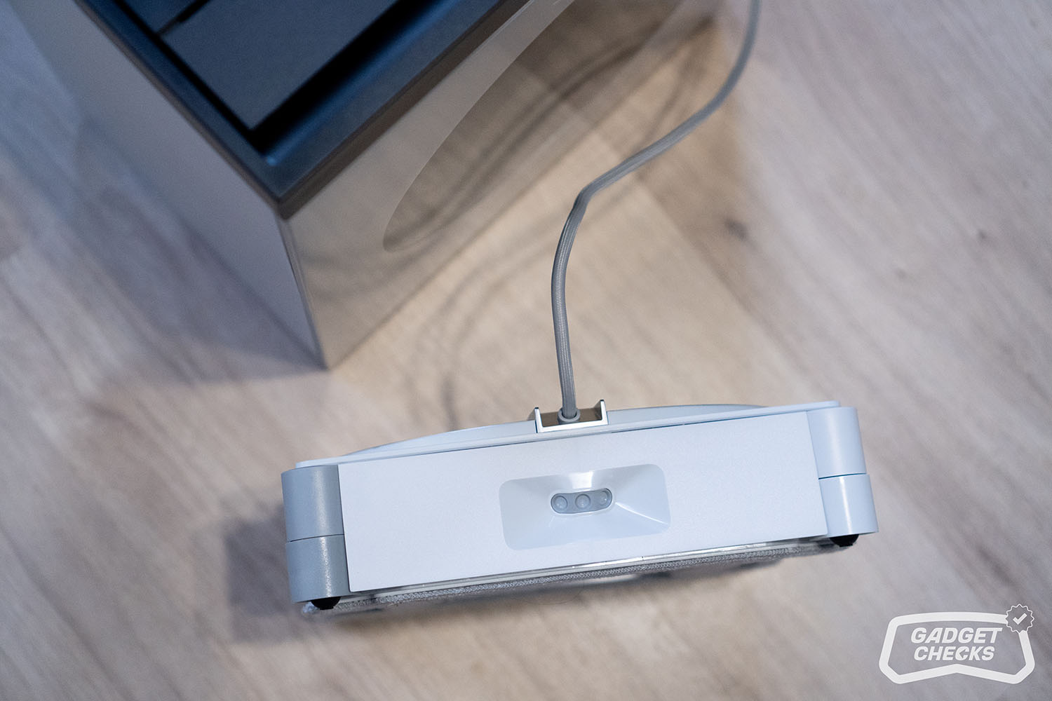 Im Zusammenspiel mit dem 12-stufigen Schutzsystem zeigt sich im Alltag schnell, wie ernst es ECOVACS mit der Sicherheit meint. Sobald sich der WINBOT W3 OMNI mit einer Haftkraft von 10.000 Pa an der Scheibe ansaugt, sitzt er sprichwörtlich bombenfest. Selbst wenn man während des Reinigungsmodus stärker am Griff zieht, bewegt sich das Gerät keinen Millimeter, was ein sehr beruhigendes Gefühl vermittelt. Diese starke Haftung ist nicht nur theoretisch vorhanden, sondern auch praktisch jederzeit nachvollziehbar. Der Roboter saugt sich dabei nicht nur kraftvoll an, sondern nutzt neben Software-Mechanismen auch mehrere Sensoren, darunter Optokoppler, einen Sensor für die Schwerkraftbeschleunigung sowie einen Luftdrucksensor, um seine Position kontinuierlich zu überwachen. Unterstützt wird das Ganze durch eine schwebend gelagerte Wischplatte, die das Entweichen von Luft reduziert und so zusätzlich zur Stabilität beiträgt. Auch das 2-in-1-Verbindungskabel ist Teil des Sicherheitskonzepts und bietet eine Zugfestigkeit von bis zu 1.000 N.