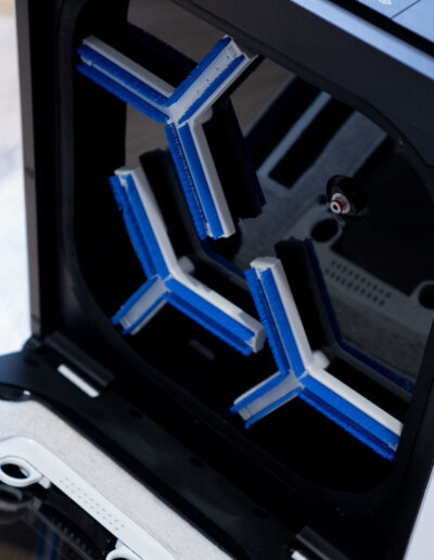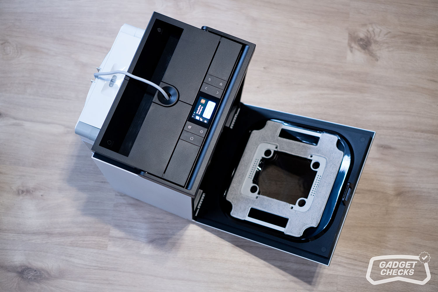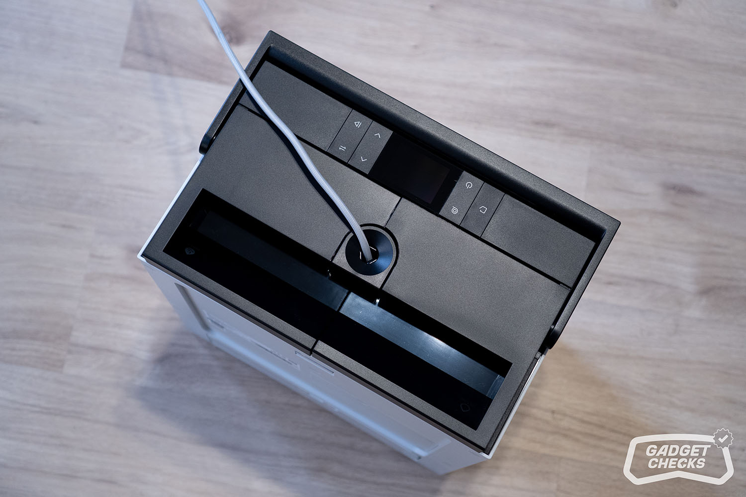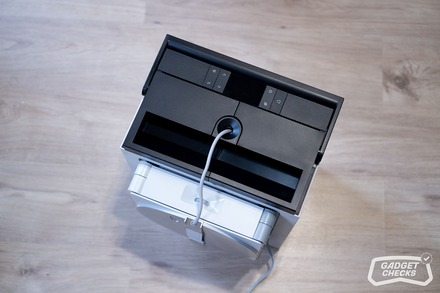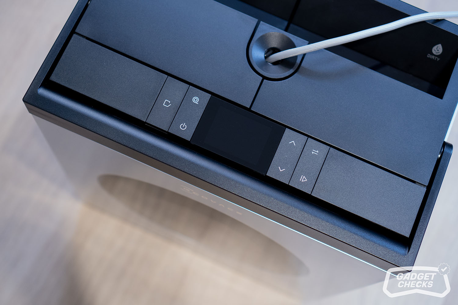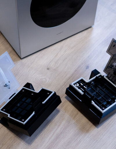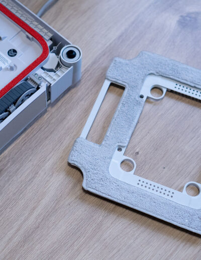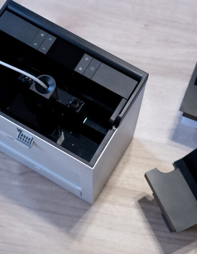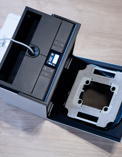 Einen markanten Kontrast bildet die schwarze Oberseite, die sich deutlich vom restlichen Gehäuse absetzt. Hier sind sowohl der Griff als auch die Bedienelemente und das integrierte Display untergebracht. Diese Gestaltung sorgt nicht nur für eine klare visuelle Gliederung, sondern hebt die zentralen Interaktionspunkte gezielt hervor. Der Griff fügt sich dabei harmonisch in die Form ein und unterstreicht den funktionalen Charakter des Geräts, ohne die klare Linienführung zu stören.