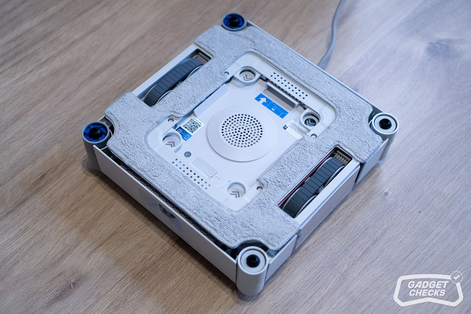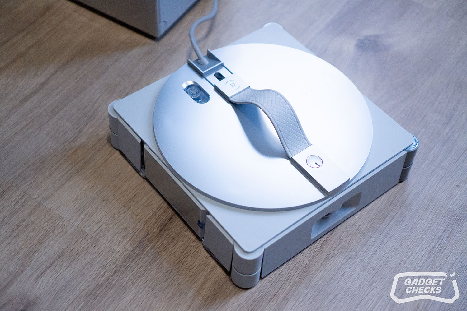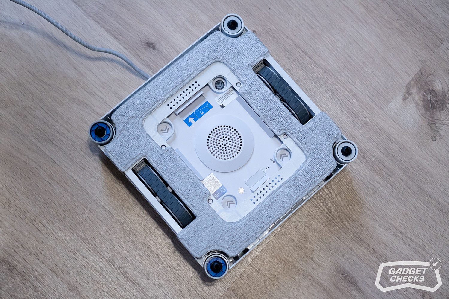 Mit einer Geschwindigkeit von bis zu 16 cm pro Sekunde arbeitet der Roboter zügig und sorgt für eine effiziente Reinigung, auch auf größeren Flächen. Das lange 2-in-1-Verbindungskabel unterstützt dabei zusätzlich, da es genügend Spielraum bietet, um auch größere Fenster problemlos abzudecken. Ist der Reinigungsvorgang abgeschlossen, greift man wieder zum Griff und hält die Powertaste für etwa zwei Sekunden gedrückt. Sobald das Ansauggeräusch verstummt, lässt sich der Roboter ohne Kraftaufwand abnehmen. Wichtig ist dabei, den Griff zu nutzen und nicht nur die Taste zu drücken.
