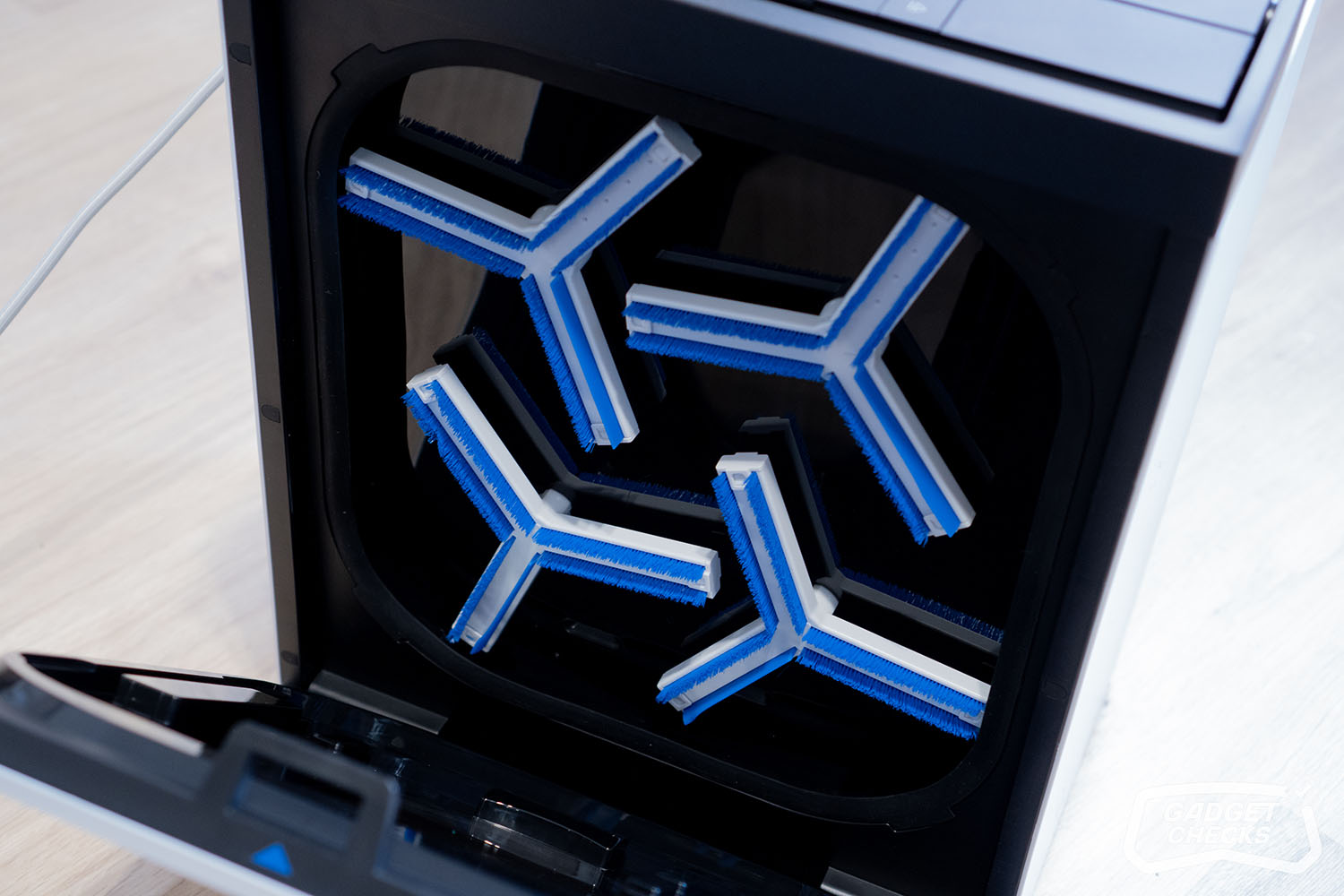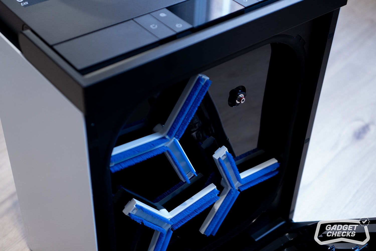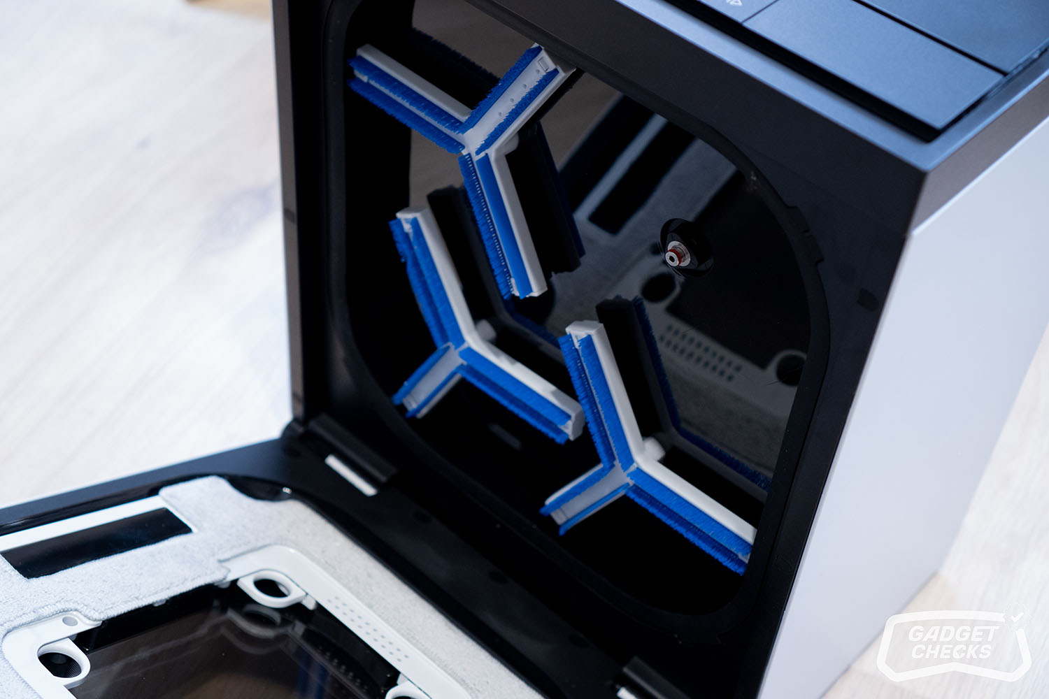 Die eigentliche Reinigung erfolgt dann automatisiert über ein recht aufwendig wirkendes System. Insgesamt sechs Hochdruckdüsen arbeiten mit einem Wasserdruck von rund 20 kPa und spülen das Wischpad gründlich durch. Unterstützt wird das Ganze von vier rotierenden Scheiben, die mit bis zu 200 Umdrehungen pro Minute arbeiten und mechanisch nachhelfen. Ein integrierter Präzisionsschaber entfernt dabei überschüssiges Schmutzwasser, sodass das Pad am Ende nicht nur sauber, sondern auch gleichmäßig aufbereitet ist. Im Test hat sich vor allem das Standardprogramm bewährt, das rund eine Minute dauert und für normale Verschmutzungen völlig ausreicht. Gerade bei der Reinigung von innenliegenden Fenstern, wo meist weniger hartnäckiger Schmutz vorhanden ist, liefert dieses Programm bereits ein sehr gutes Ergebnis. Für stärkere Verschmutzungen steht zusätzlich ein intensiveres Reinigungsprogramm zur Verfügung, das entsprechend gründlicher arbeitet.