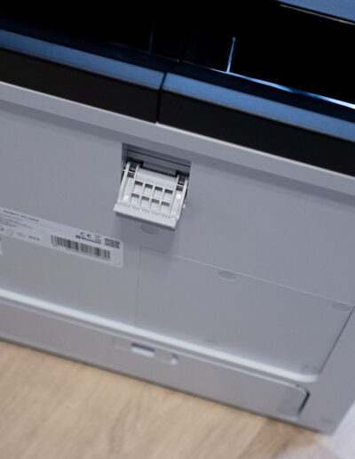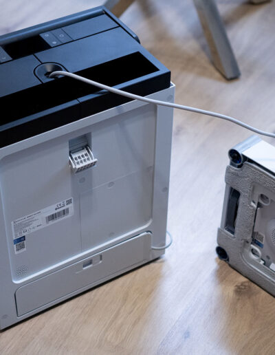 Der Betrieb ist grundsätzlich auch ohne Akku möglich. Da dieser aber keinen Platz wegnimmt oder stört, bietet es sich an, ihn direkt zu installieren. Gerade dann, wenn man das Gerät einmal ohne direkten Stromanschluss nutzen möchte, ist das ein praktischer Vorteil. Der Akku wird dabei über einen Schraubmechanismus fixiert und seitlich in das vorgesehene Fach eingesetzt. Ist alles eingerichtet, bleibt der Akku dauerhaft im Gerät, sodass man sich im Alltag nur noch um das Herausführen des Kabels oder das Sicherungsseil kümmern muss. Positiv fällt dabei auch die Gestaltung der Abdeckung auf. Auf der Rückseite ist eine flexible Silikon-Lasche integriert, durch die sich Kabel sauber nach außen führen lassen, ohne dass etwas eingeklemmt wird oder unsauber sitzt. Das wirkt im Detail gut gelöst und passt zum insgesamt durchdachten Eindruck der Einrichtung.