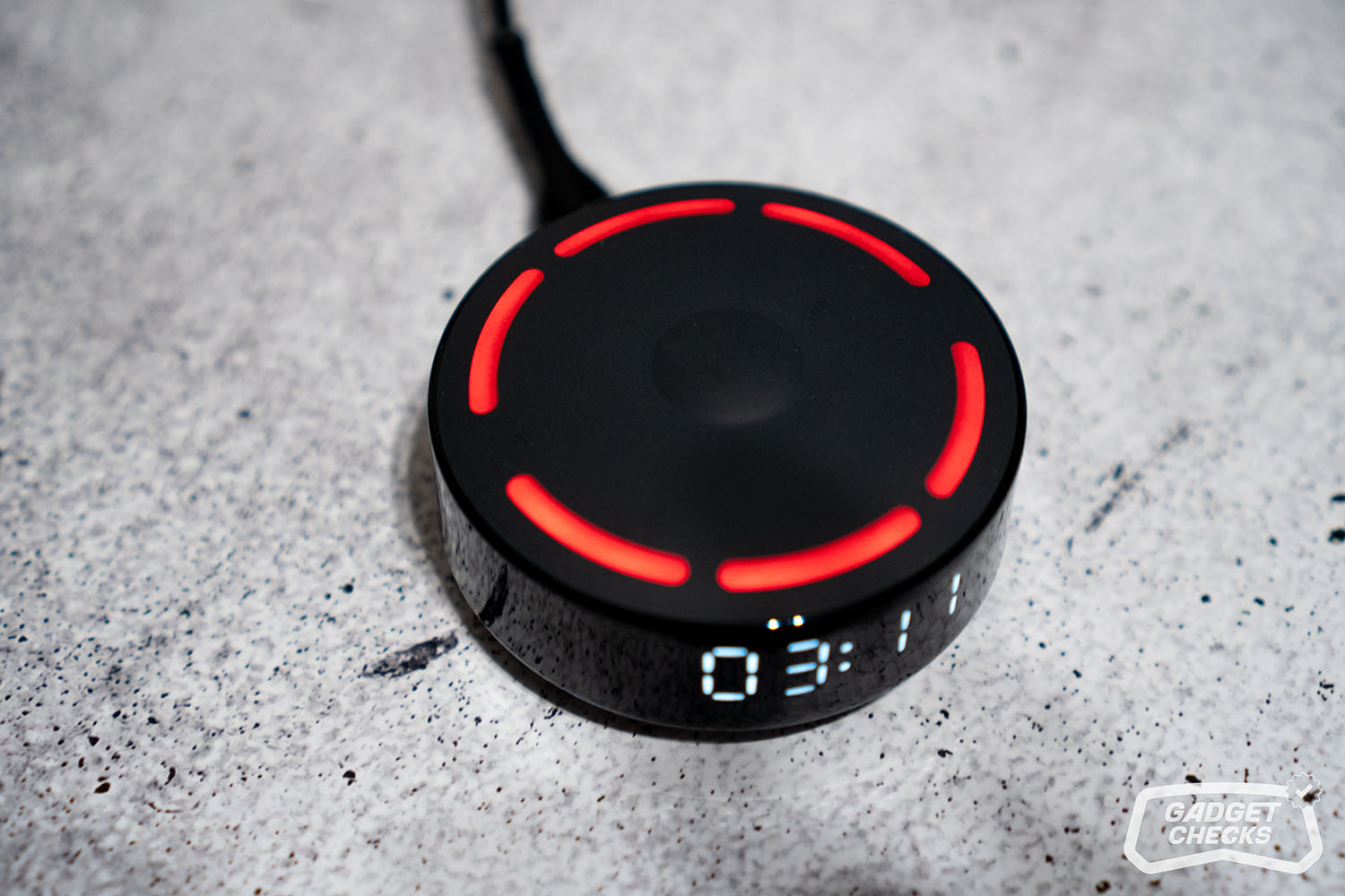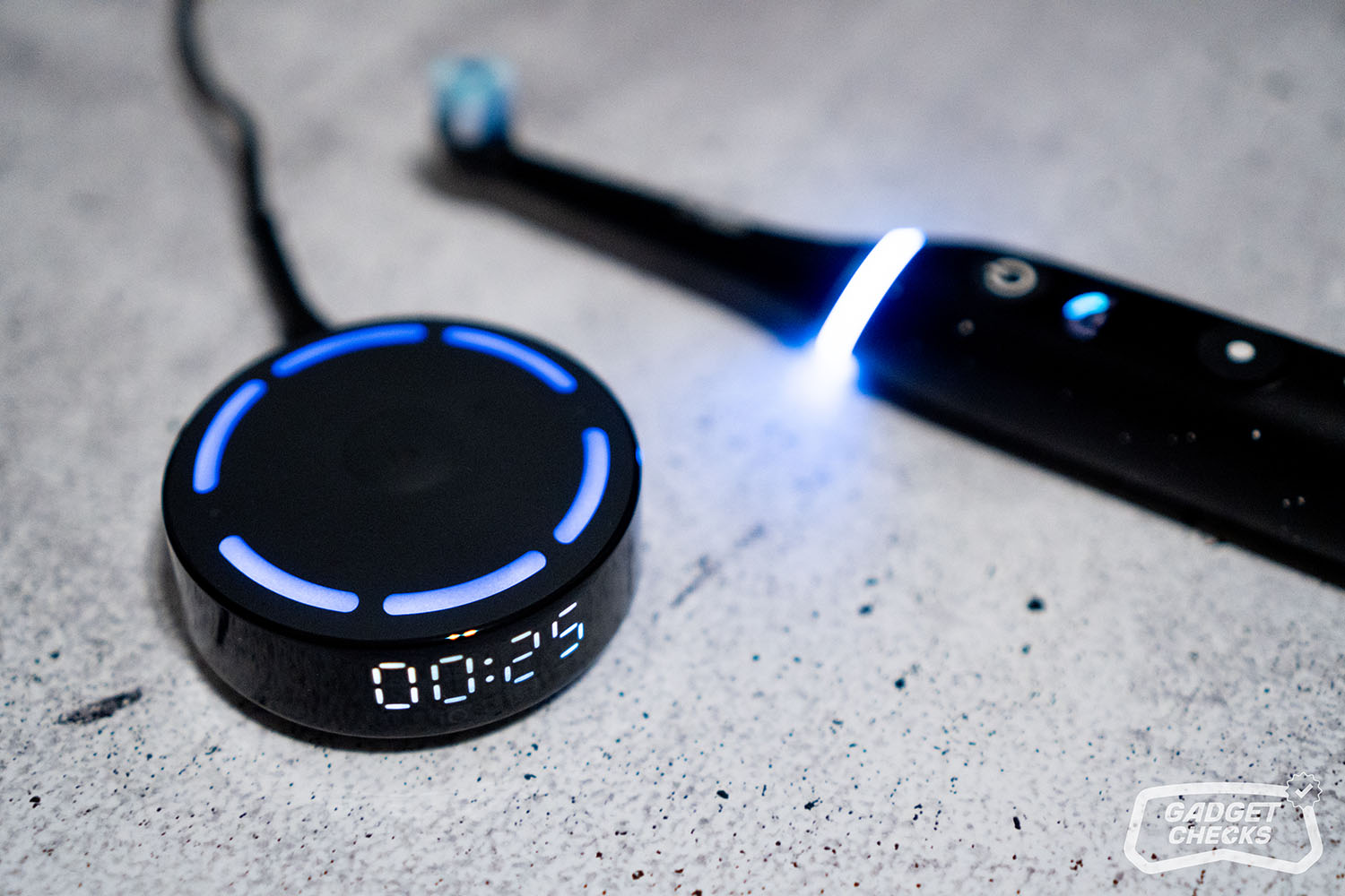 Für zusätzlichen Komfort sorgt die magnetische Halterung der iOSense-Ladestation, die einen sicheren Stand gewährleistet und das Aufsetzen des Handstücks beim Laden besonders einfach macht. Die magnetische Fixierung ist ausreichend stark ausgelegt, dennoch sollte berücksichtigt werden, dass die Bauhöhe der Zahnbürste bei einem kräftigeren Stoß ein Umkippen nicht vollständig ausschließt. Positiv hervorzuheben ist zudem die auf der Vorderseite integrierte Uhranzeige. Sie fügt sich unauffällig in das Display der Ladestation ein und erweist sich im Alltag als praktisches Detail, da auf eine separate analoge Uhr im Badezimmer verzichtet werden kann.