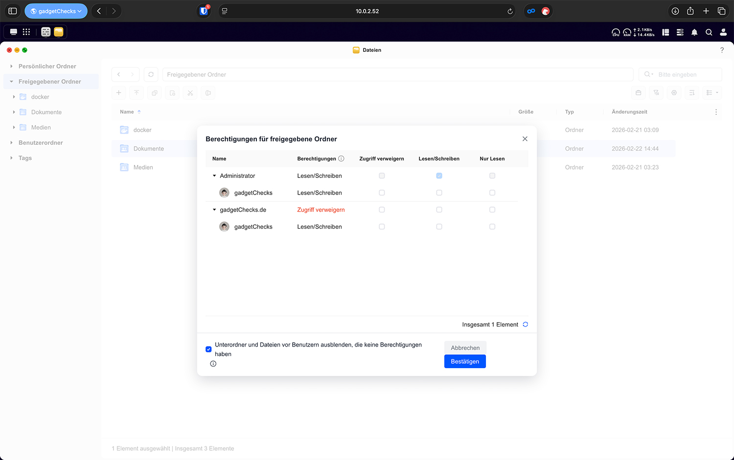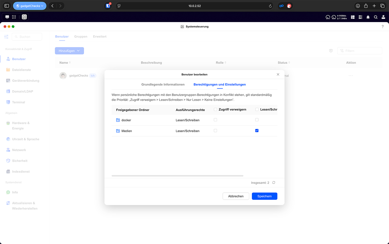 Im Bereich „Berechtigungen und Einstellungen“ können explizite Rechte auf einzelne Freigaben gesetzt werden. Die Prioritätsregel lautet: „Zugriff verweigern > Lesen/Schreiben > Nur Lesen > Keine Einstellung“. Eine explizite Verweigerung überschreibt Gruppenrechte. Diese Funktion sollte gezielt und bewusst eingesetzt werden, da sie sonst zu unerwarteten Zugriffsbeschränkungen führen kann.
