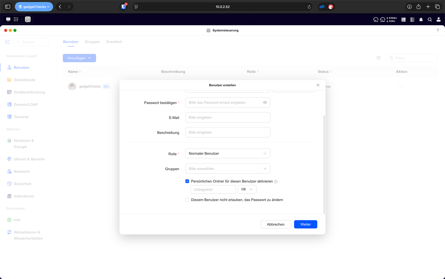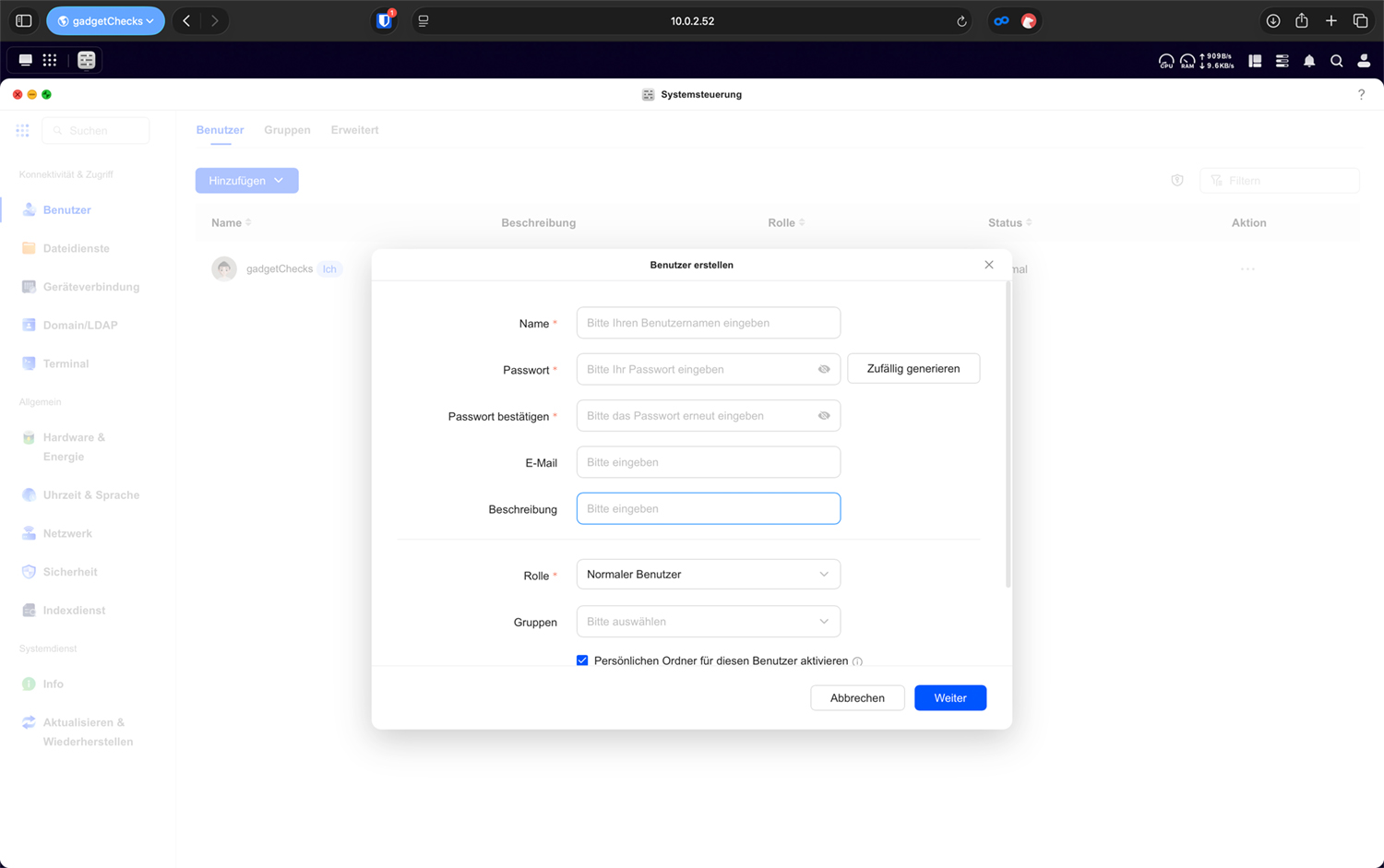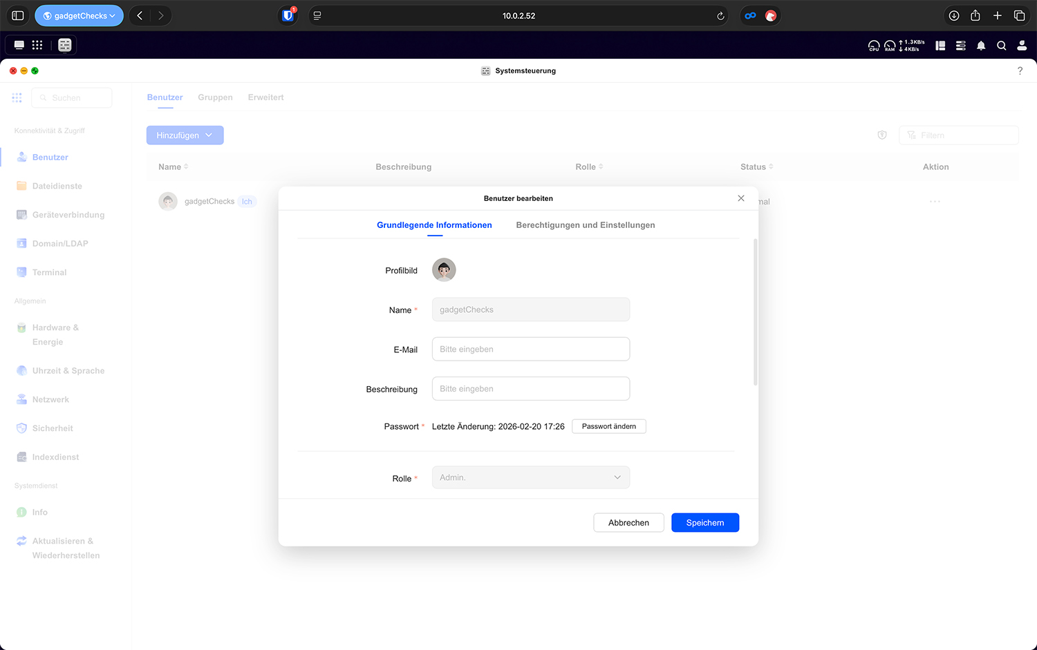 Der Benutzername sollte eindeutig, dauerhaft und ohne Sonderzeichen gewählt werden. Er bildet die Grundlage für das Home-Verzeichnis und kann später nicht beliebig geändert werden, ohne dass Ordnerstrukturen oder Dienste betroffen sind. Gerade in Unternehmen sollte daher eine saubere Namenskonvention festgelegt werden. Das Passwort sollte den zuvor definierten Passwortregeln entsprechen. Hier geht es nicht um Theorie, sondern um realen Schutz: Schwache Kennwörter können automatisiert erraten werden, auch im Heimnetz. Die E-Mail-Adresse ist optional, kann jedoch sinnvoll sein, wenn Benachrichtigungen oder Passwort-Zurücksetzungen genutzt werden.