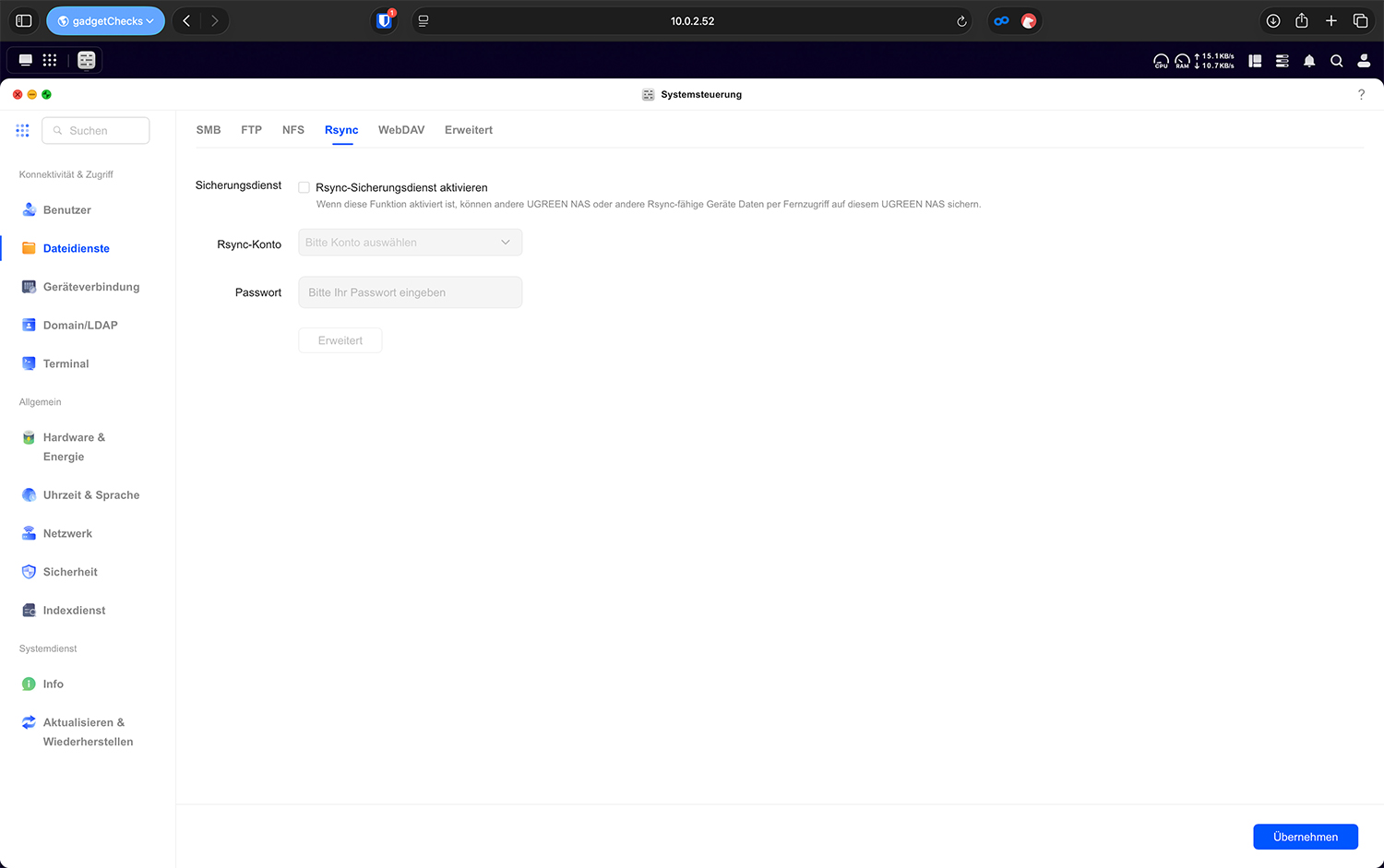 Rsync ist kein normales Zugriffsprotokoll, sondern ein Synchronisations- und Backup-Dienst. Er wird genutzt, um Daten zwischen zwei NAS-Systemen oder von einem Server zum NAS zu sichern. Im Privathaushalt ist Rsync nur dann relevant, wenn: