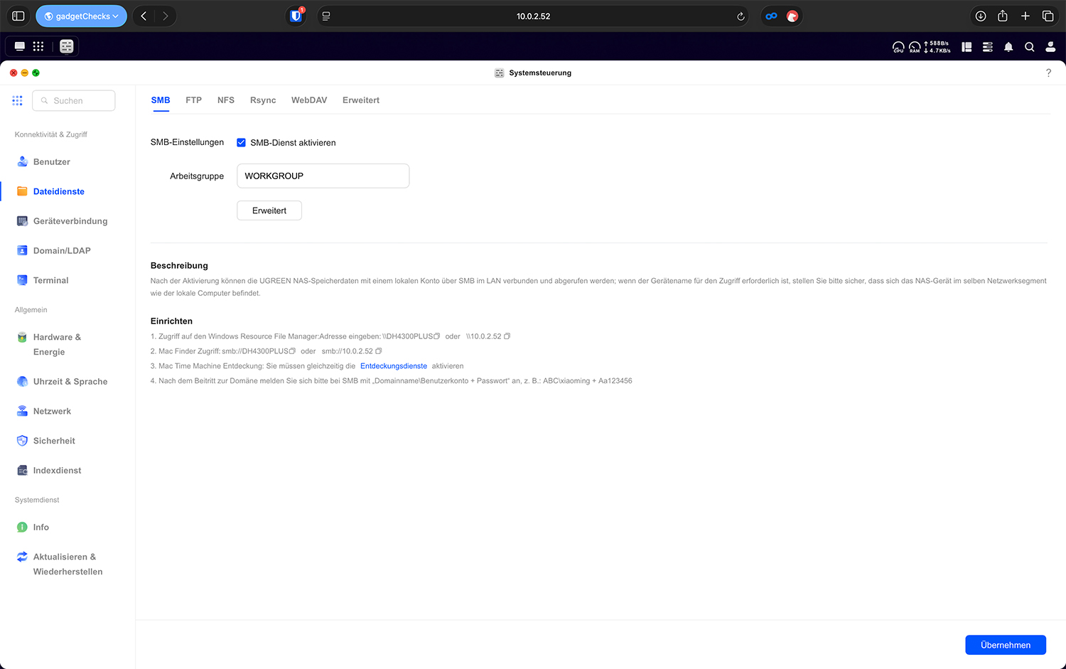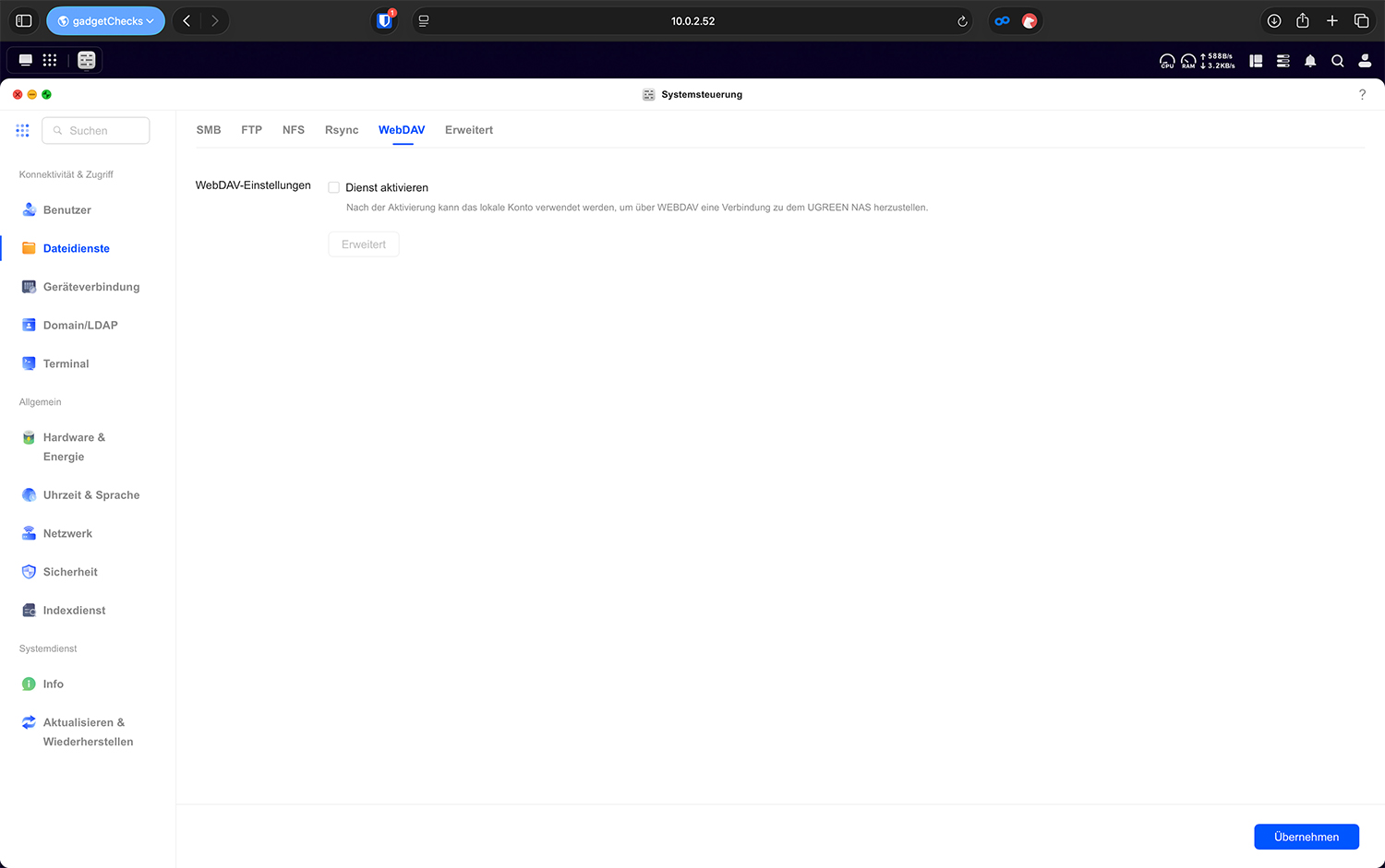 Unter „Dateidienste“ wird festgelegt, über welche Protokolle das UGREEN NAS im Netzwerk erreichbar ist. Technisch betrachtet sind das unterschiedliche „Sprachen“, über die Computer mit dem Speicher kommunizieren. Je mehr Dienste aktiviert sind, desto mehr Angriffsfläche und Komplexität entsteht. Deshalb gilt hier ein klarer Grundsatz: Nur aktivieren, was tatsächlich benötigt wird.
