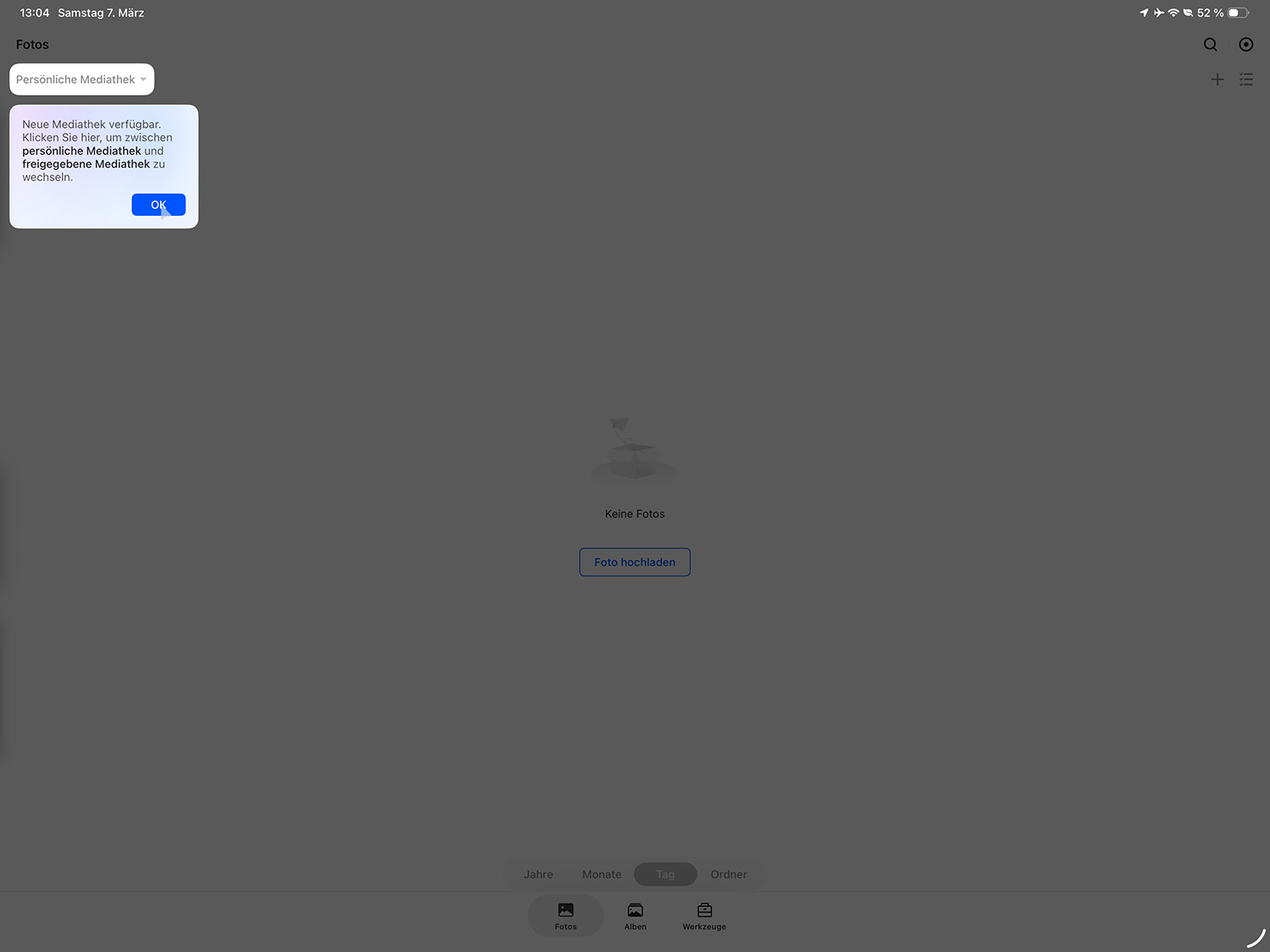 Anschließend öffnet sich die mobile Oberfläche der Fotos-App. Beim ersten Start kann zunächst ein kurzer Hinweis erscheinen, dass eine neue Mediathek verfügbar ist. Dieser Hinweis kann bestätigt werden.