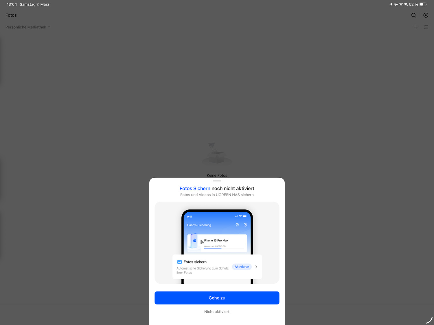 Direkt danach erscheint ein weiterer Assistent, der darauf hinweist, dass die automatische Fotosicherung noch nicht aktiviert ist. Über den Button Gehe zu kann die Einrichtung der Fotosicherung sofort gestartet werden.