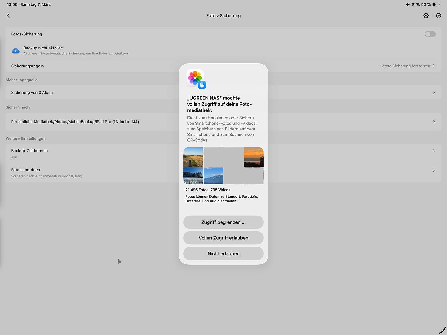 Hier sollte die Option Vollen Zugriff erlauben gewählt werden. Nur mit vollständigem Zugriff kann die Anwendung alle Fotos und Videos sichern. Wird der Zugriff eingeschränkt oder verweigert, kann die automatische Sicherung nicht korrekt funktionieren.