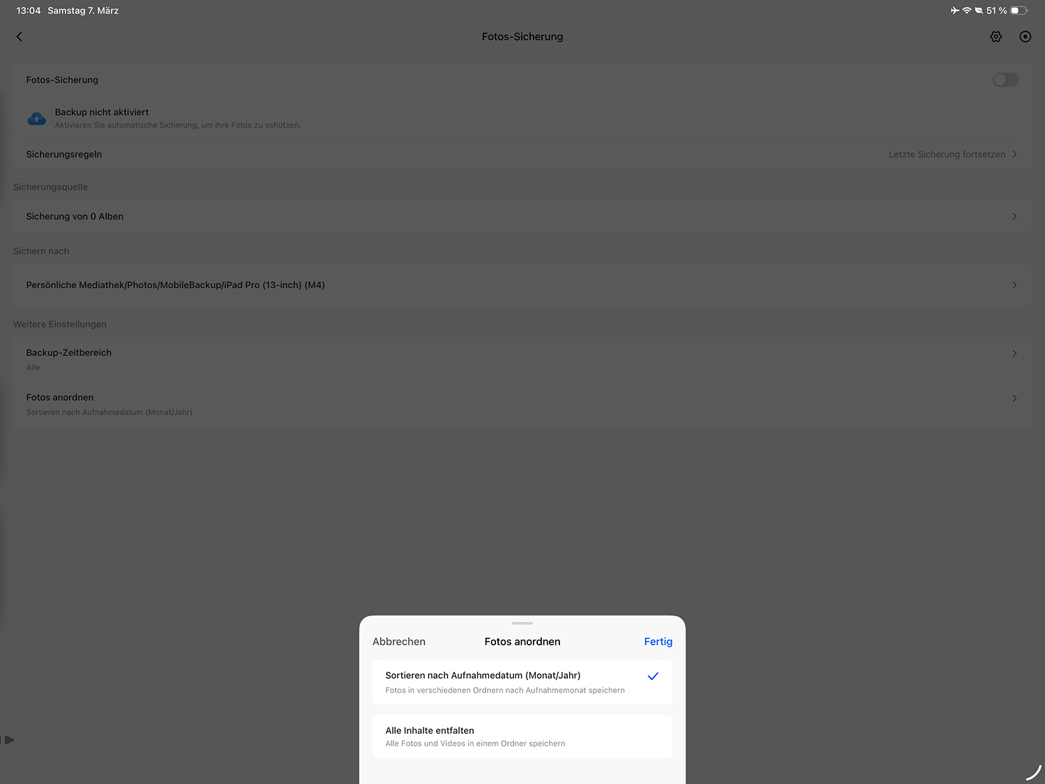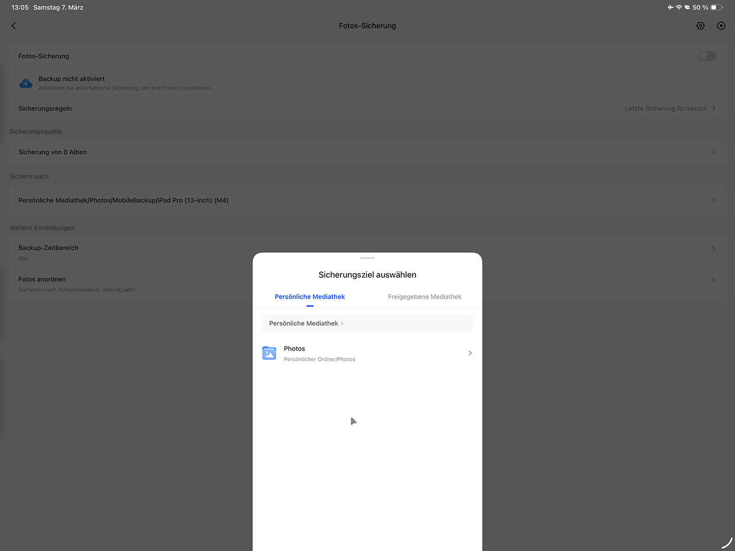 Der Ordner wird von der App automatisch erstellt, sobald die Sicherung eingerichtet wird. Alternativ kann auch ein anderer Zielordner ausgewählt werden, wenn die Bilder beispielsweise in einer bestehenden Ordnerstruktur gespeichert werden sollen.