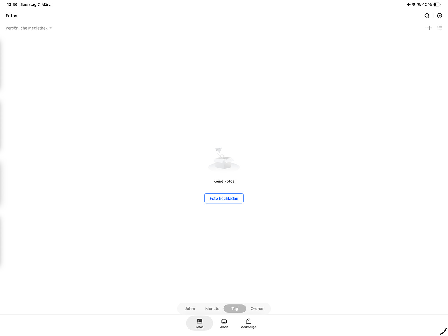 Nach dem Schließen der Assistenten öffnet sich die Hauptoberfläche der Fotos-App. Da sich beim ersten Start noch keine Bilder in der persönlichen Mediathek befinden, wird zunächst eine leere Ansicht angezeigt. In der Mitte der Oberfläche befindet sich der Button Foto hochladen, über den Bilder manuell vom Gerät auf das NAS übertragen werden können.